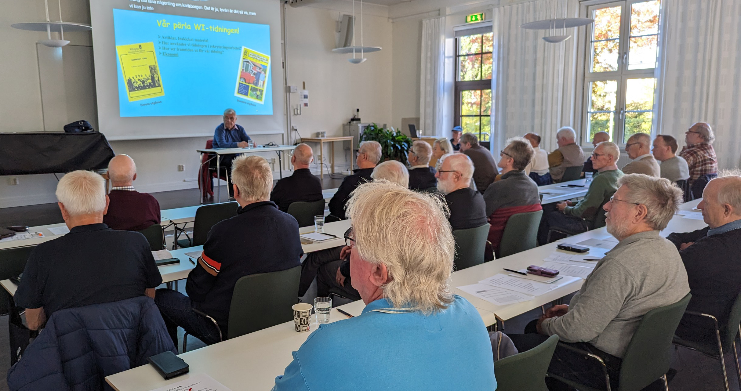 Mötesdeltagarna hälsades välkomna av WIS ordförande Kjell Nordström medan Janne Åberg står beredd att sköta den grafiska presentationen
